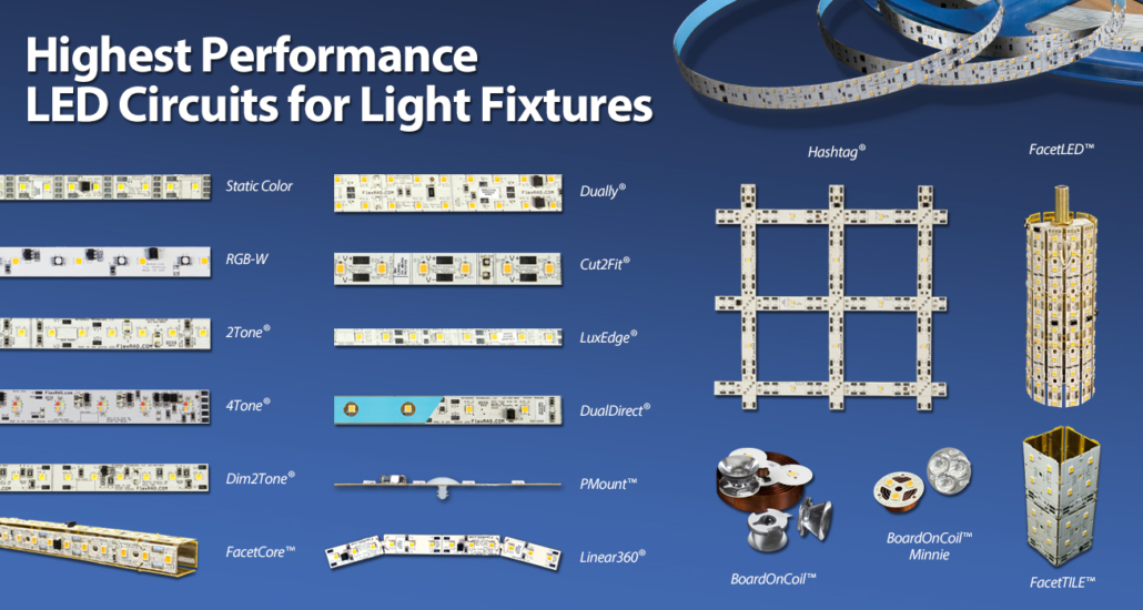 In all of its forms, FlexRad is the most powerful, versatile, and most reliable LED light technology available. FlexRad includes a variety of technologies that allow fixture manufacturers to fill almost any shape with light. The novel applications of FlexRad include Cut2Fit®, FacetCore™, Linear360®, Hashtag®, BoardonCoil™, Dim2Tone®, 4Tone®, FacetLED™, FacetTILE™, LuxEdge® MAX, and LuxEdge® Halo.